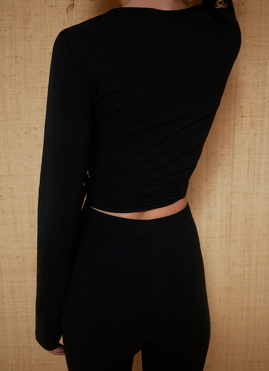 Wren wrap top is made in a soft, stretchy cotton blend that sits comfortably and follows the body with ease. Designed with long straps that tie around the waist, offering an adjustable fit and a clean, minimal look.